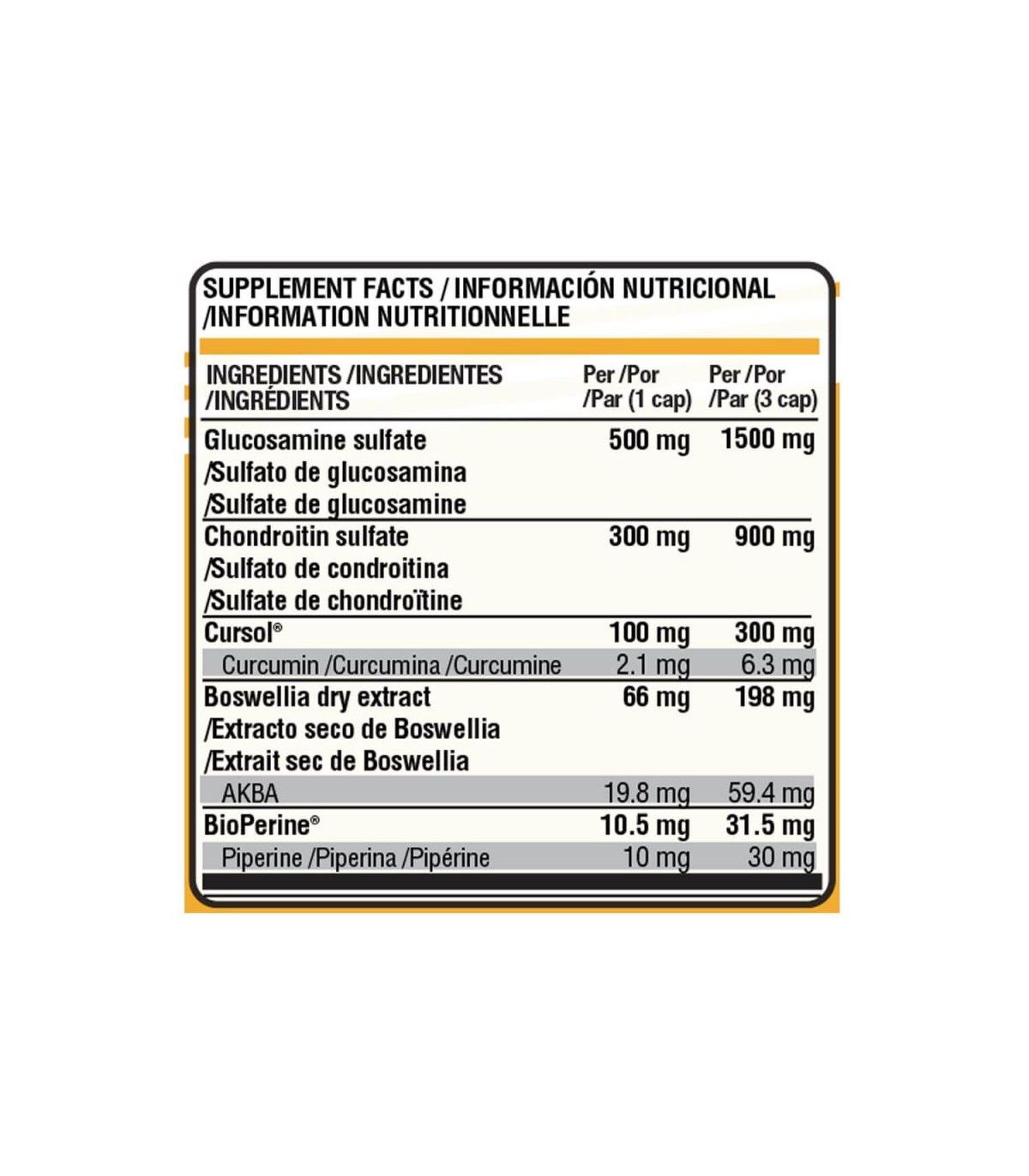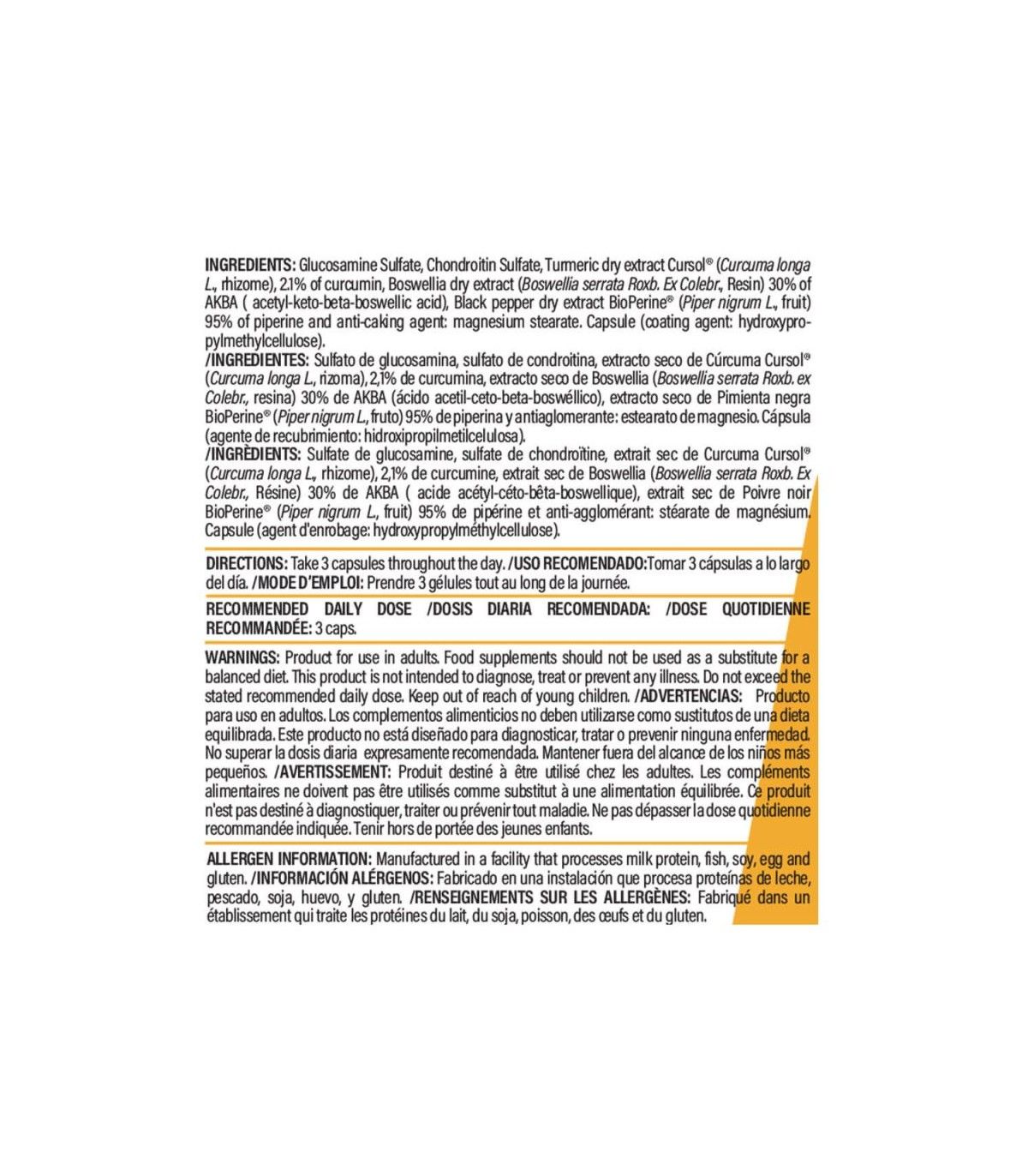 Artilife Pro Glucosamine contiene los siguientes ingredientes: sulfato de glucosamina, condroitina sulfato, curcumina (Cursol®), extracto de pimienta negra (Bioperine®) y boswellia serrata.