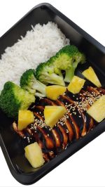(150gr chicken, 150gr rice, 50gr pineapple, 50gr vegetables, 100ml teriyaki sauce)