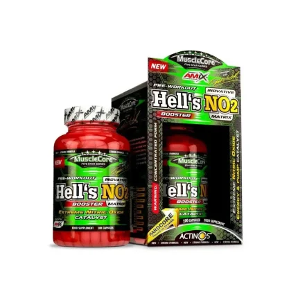 El Pre-entreno Hell's NO2 de Amix MuscleCore es un producto para tomar antes de un entrenamiento que contiene que contiene ActiNOS™ en combinación con L-arginina alfa-cetoglutarato, Beta-Alanina (CarnoSyn®), ALA, Cafeína, Zinc, vitaminas B6 y vitaminas B12