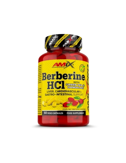 La Berberina HCl de Amix es un complemento alimenticio en cápsula vegetal apto para veganos, que contiene extractos de Berberina, Té verde y de Diente de León