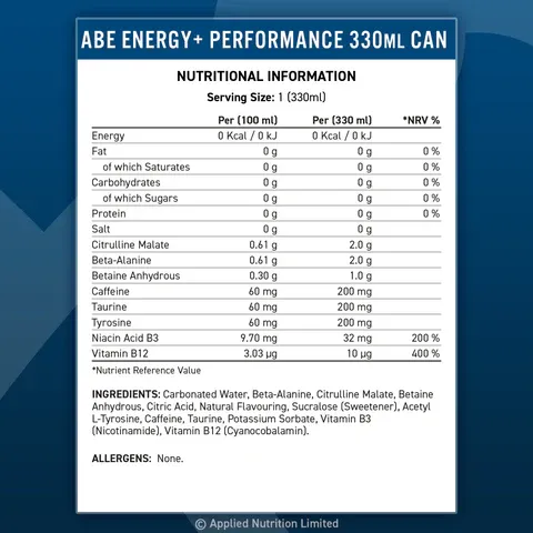ABE Applied Nutrition 330ml es una bebida energética carbonatada diseñada para aquellos que buscan un impulso en su rendimiento físico y mental. Esta bebida sin azúcar contiene 200 mg de cafeína, citrulina, beta-alanina, taurina, y vitaminas B3 y B12. ABE ofrece el poder del preentrenamiento más vendido del Reino Unido en un formato conveniente y listo para llevar.